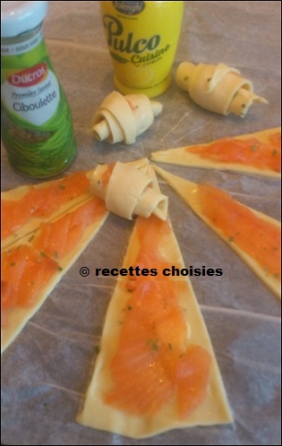 Commencez par les mini croissants de saumon en déposant sur 8 parts