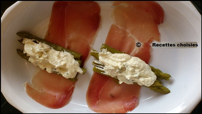 Mettez 4 asperges au milieu de chaque tranche.